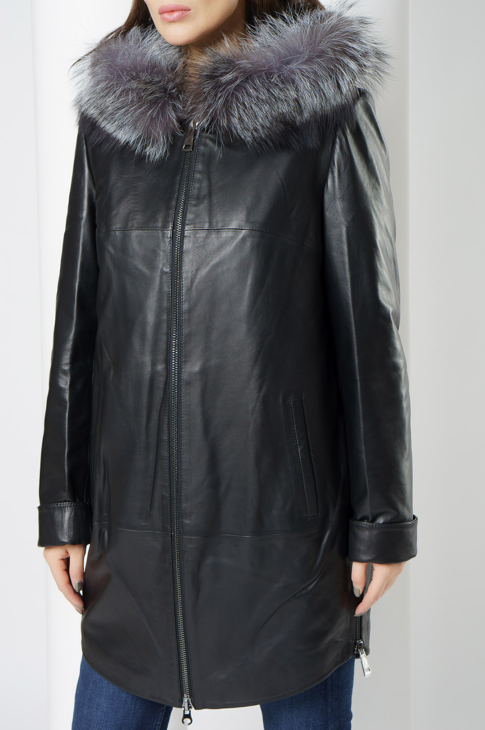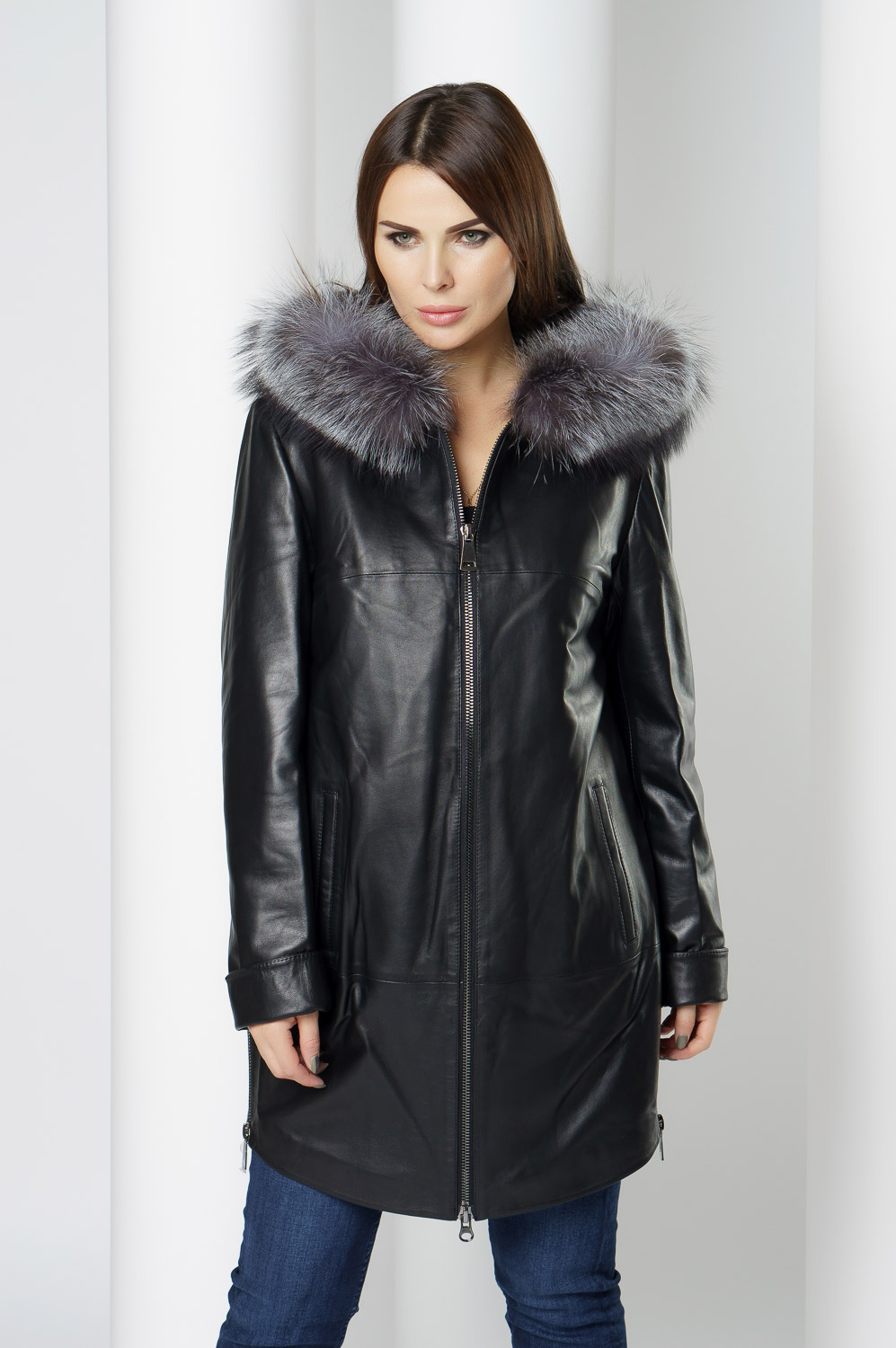 Утепленное пальто из натуральной кожи украсит ваши дождливые будни. Капюшон с отделкой из меха чернобурки согреет в ветреную погоду. Удобный фасон позволит совершать длинные прогулки. Утеплитель обеспечит комфортное пребывание на улице. С помощью молний по бокам изделия вы можете отрегулировать низ модели.