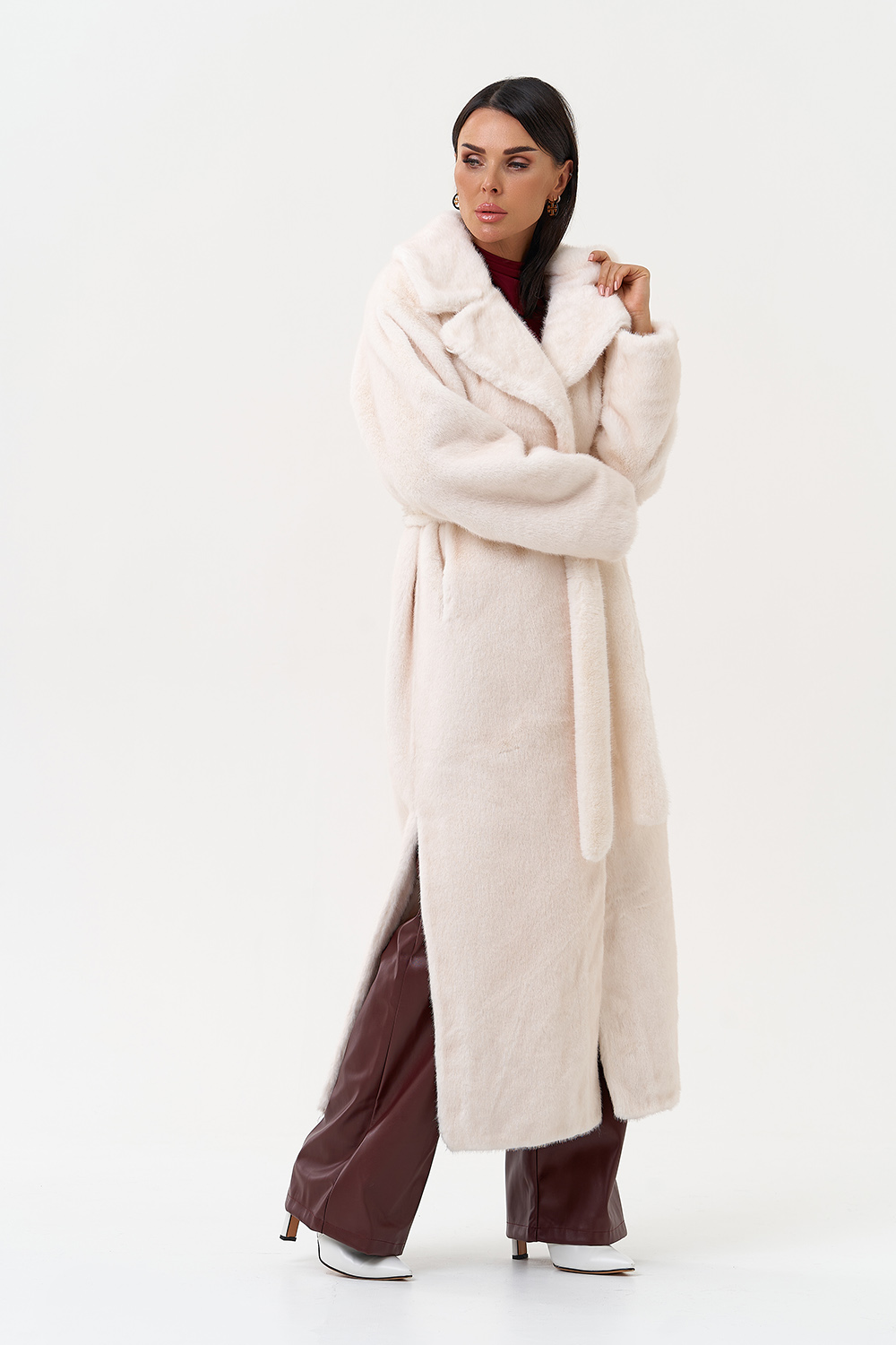 Фасон - прямой Длина изделия - 130 см Цвет - светло-бежевый (молочный) Материал - экомех Состав полотна - полиэстер 100% Подкладка - полиэстер 100% Вид застежки -крючки, пояс Вид ворота - английский воротник Фасон рукава - втачной, длинный |